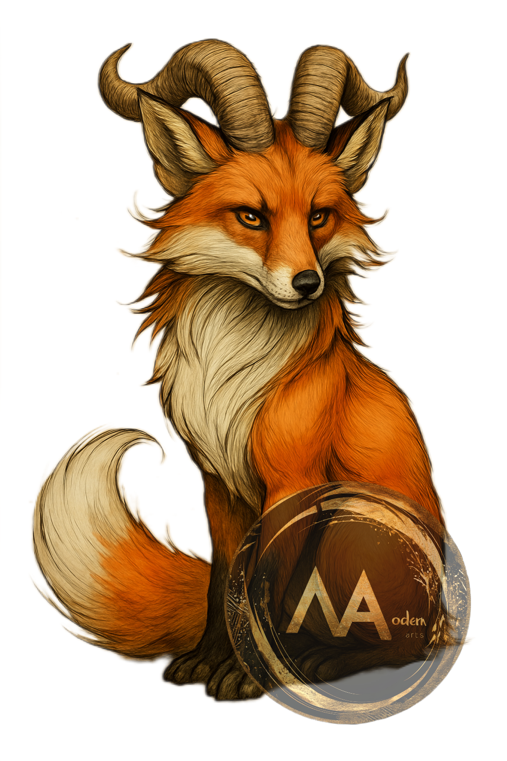 Ein einzigartiges Fabelwesen-Motiv – ein majestätischer Fuchs mit kraftvollem Steinbockgeweih und tiefschwarzen Augen, die direkt in die Seele blicken. Dieses Kunstwerk vereint Stärke, Wildheit und Geheimnis in einem Symbol.
